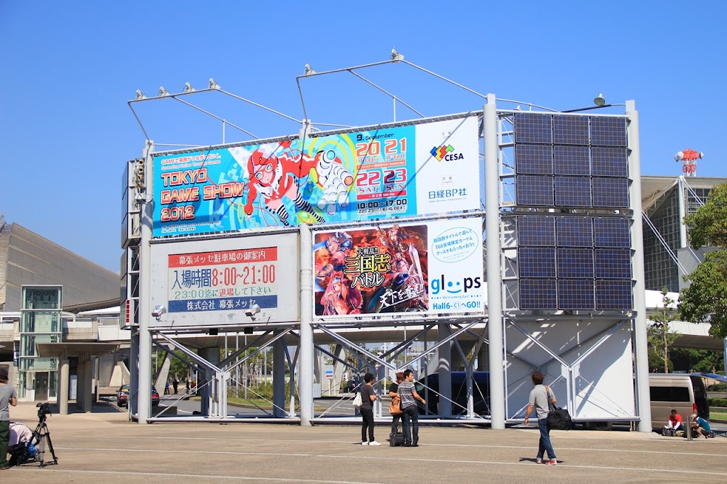 海濱幕張站就如同去年一樣,今年還是被NBGI給包下,強力宣傳著《Project X Zone》這款由CAPCOM、NAMCO BANDAI、SEGA三社眾多角色共演的話題作。出了海濱幕張站時有些意外,因為前往慕張展覽館方向的人潮並沒有預期得多,明明去年來的時候站前這條通道還算有些壅擠的。展覽館前的電擊PlayStation旗幟廣告依舊,但其實光《人中之龍5》一作就佔去了五個欄位,完全沒有過去一連多款大作迎面而來的感覺,甚至今年展館建築物上也沒有任何廣告曝光,雖然說我是在9月20、21兩日,也就是入場人數本來就會比較少的「業者日」前往參觀,但這種還沒入場就感受得到的冷清感,相信連續幾年都有來參觀TGS的人多少都能體會吧。