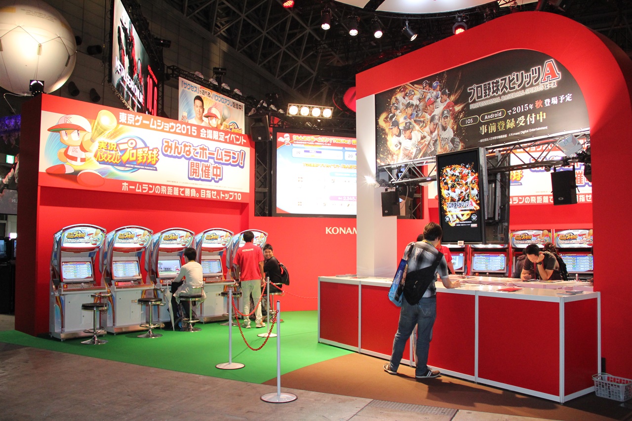 KONAMI 這次主要展出的家用遊戲只有《潛龍諜影V》附屬的《潛龍諜影 ONLINE》和《Winning Eleven 2016》兩款,《實況野球》雖然是用大型電玩框體來讓人進行全壘打大賽,但實際遊玩的是手機板。還有《野球魂A》與《PES Club Manager》的展出,當然也都是手機版的遊戲。KONAMI 在現場針對兩款足球題材遊戲發送的是印有知名球星內馬爾頭像的紙扇,但說實在的這樣直接印個不連身體的人頭像,感覺怪不舒服的。另外,Falcom 的新作《東京沙納多》也附屬在 KONAMI 的攤位旁展出。